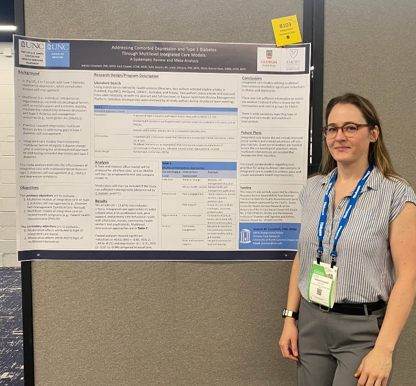 Jeanna Campbell, PhD, MSW is a second year National Research Service Award Postdoctoral Fellow in Primary Care Research and the first trained social worker to earn the fellowship with the Cecil G. Sheps Center. She developed an interest in social work and primary care from her experiences living in poverty with diabetes. Her team’s research, featured at the Society for Behavioral Medicine 47th Annual Meeting & Scientific Sessions in Chicago, IL, highlights how social workers are missing from integrated primary care teams that seek to address social determinants of health, such as poverty, and comorbid diabetes and depression.