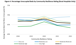 - The average percentage of rural hospital acute care beds that were unoccupied from 2018 to 2022 remained above 60% when stratifying hospitals by community characteristics and geographic remoteness.